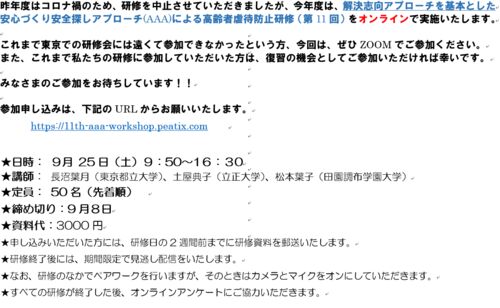 過日ご案内させていただいた、第11回安心づくり安全探しアプローチによる高齢者虐待防止研修のスケジュールが決まりました。 参加申し込みは、https://11th-aaa-workshop.peatix.com からお願いします。